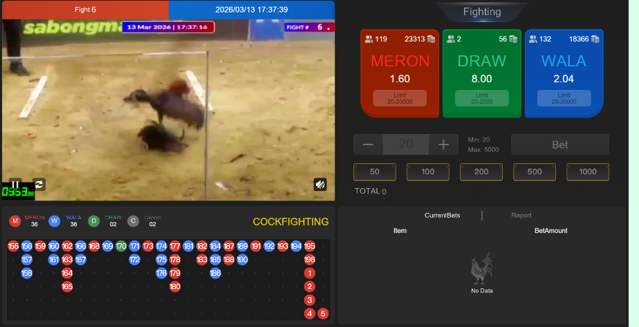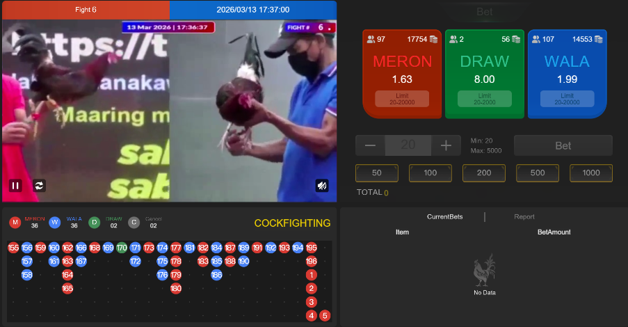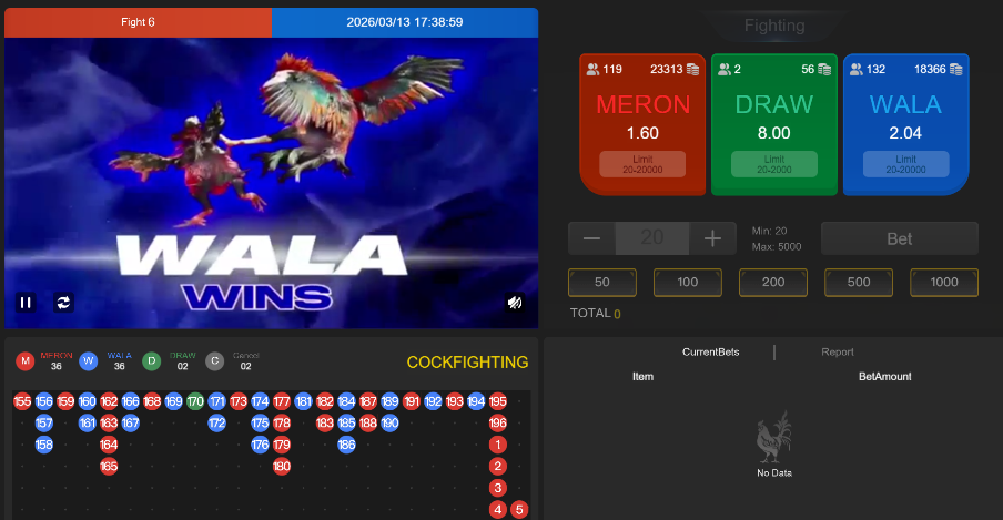 On the right side is the betting area, which mainly provides three options: MERON (red side), WALA (blue side), and DRAW (tie).